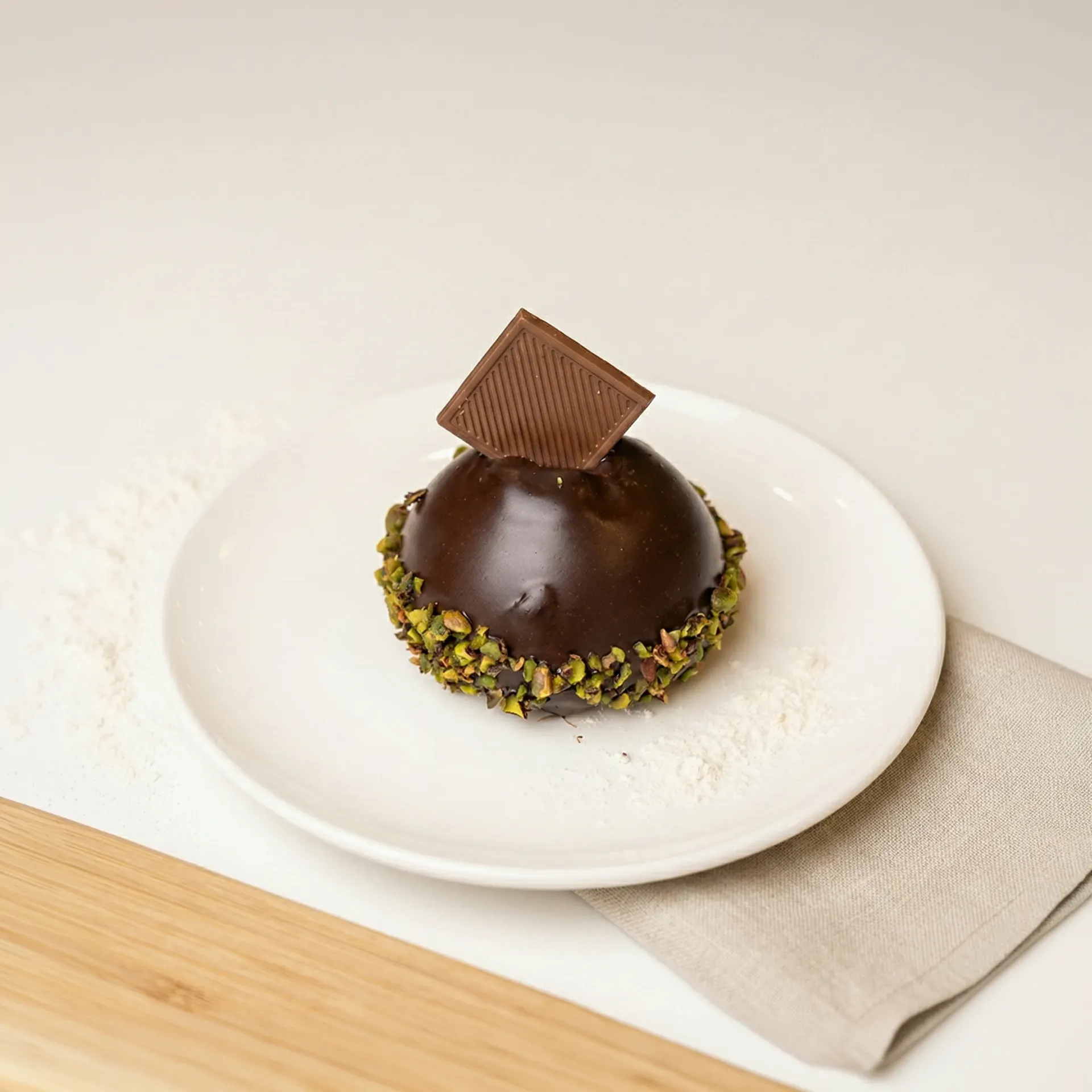 Devis kek arasında mousse kreması, Antep fıstığı ve ganaj sos.